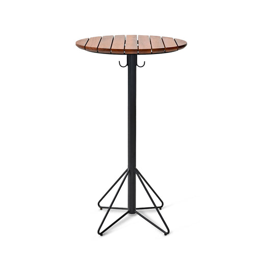 屋外使用に適した高い耐久性と、無垢材のあたたかみのある質感が魅力。スチール脚のシャープな印象が全体を引き締め、シンプルながら存在感ある佇まいに。アウトドアバーやカフェテラスに最適なスタイリッシュなハイテーブルです。天板下の支柱に荷物がかけられるフックがあります。 materials :TOP:...